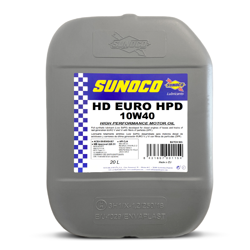 SUNOCO HEAVY DUTY EURO HPD 10W-40 – це повністю синтетична ультраефективна моторна олива на основі новітньої low SAPS* технології присадок. Ця олива була спеціально розроблена для важконавантажених дизельних двигунів, які використовуються у вантажівках та автобусах, що відповідають найсуворішим Європейським вимогам щодо викидів EURO VI.